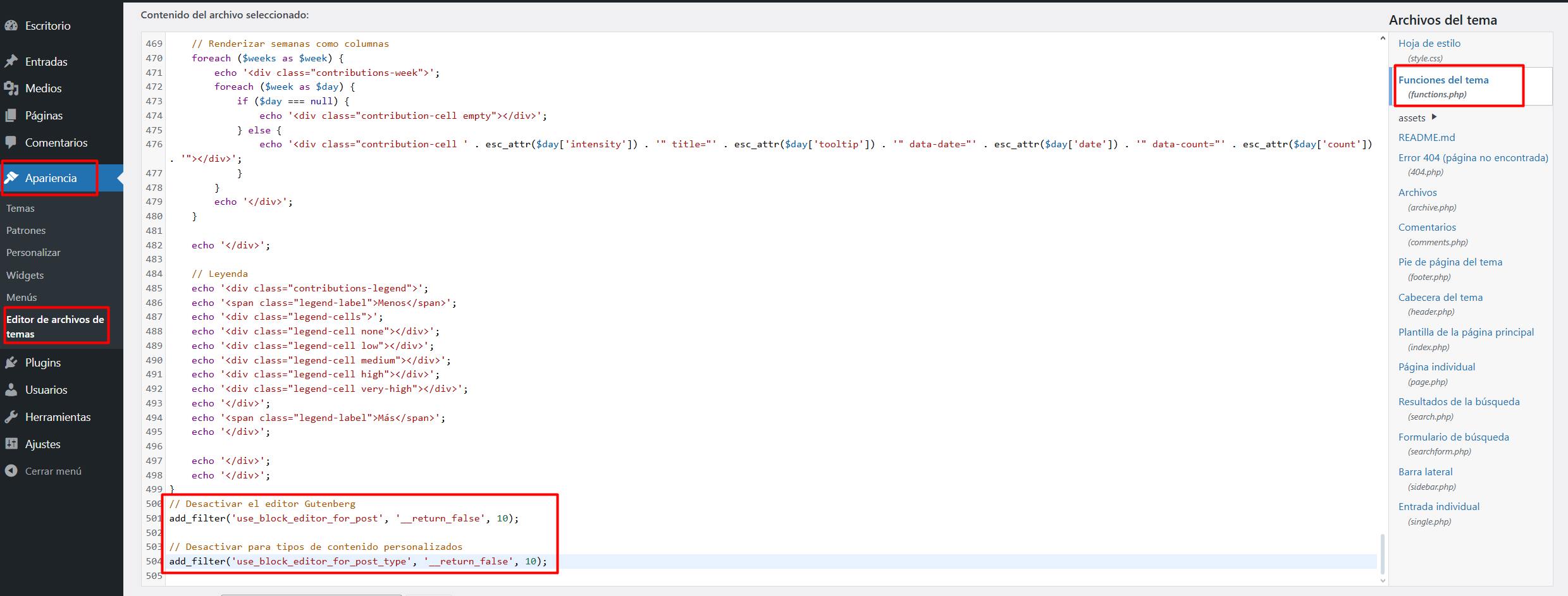 Para habilitar el editor clásico, debes agregar un fragmento de código al archivo functions.php de tu tema. Sigue estos pasos: