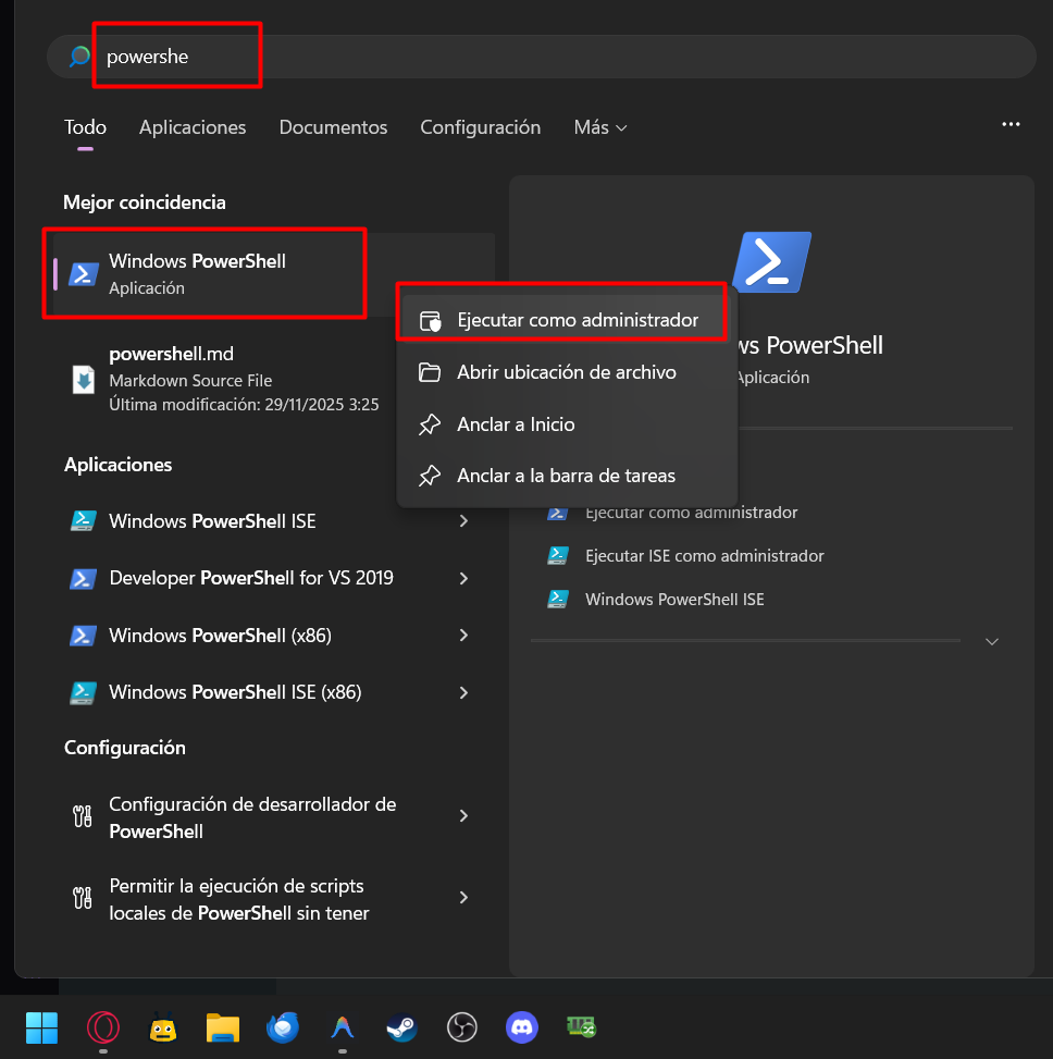 Abre PowerShell como administrador (clic derecho en Inicio > «Windows PowerShell (Administrador)») y ejecuta: