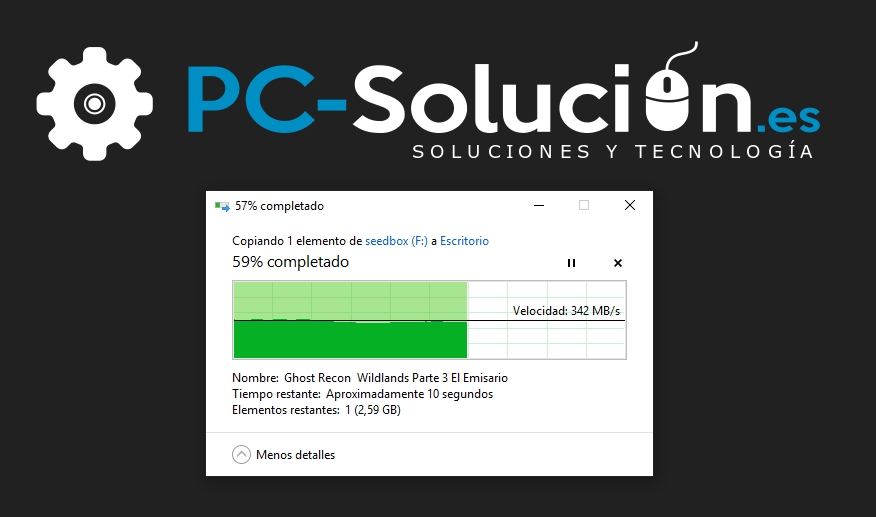 Ahora copiamos el mismo archivo grande de vídeo del Kingston A400 a otro disco y obtenemos una velocidad de lectura de 342 MB/s aproximadamente.