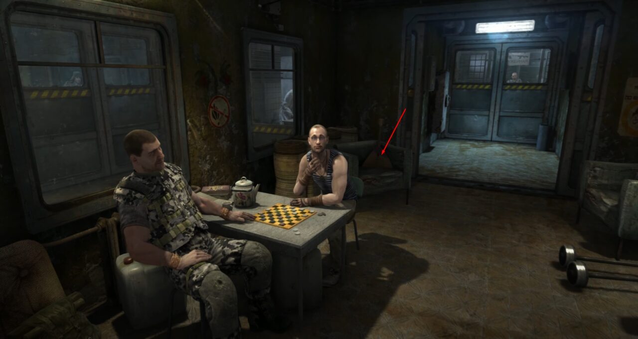 En esta sala, detrás de los hombres que están jugando al juego de mesa hay un sillón en el que tenemos una guitarra que podemos tocar y que nos conseguirá otra buena acción.